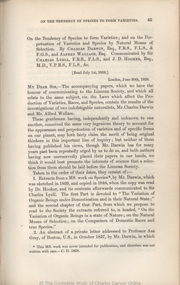 Vorzimmer, P. 1975. An early Darwin manuscript: The "Outline and Draft of 1839". Journal of the History of Biology. Text A2063